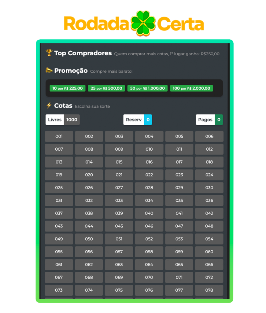 As cotas podem ser adquiridas exclusivamente pelo nosso site. Basta escolher a quantidade desejada, efetuar o pagamento e receber a confirmação com seu(s) número(s) de participação.